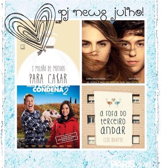 Para começar, esse mês tem dois filmes que estou ansiosa para assistir. Primeiro: Meu Passado me Condena 2 (já estreou). Adoro o Fábio e a Miá! Ri muito no primeiro e acho que vou chorar de tanto rir no segundo. ;-) Daí, vem John Green com mais uma história que saiu das páginas de um livro (que por sinal, ainda não li) direto para o cinema: Cidades de Papel (estreia dia 9 de julho). Pelo trailer, acho que no mínimo eu vou adorar. Bom, assim espero! Quanto aos livros: fiquei muito curiosa para embarcar no chic lit da irmã mais nova da Sophie Kinsella: 1 milhão de motivos para casar. Espero que a Gemma seja tão talentosa quanto a irmã. Também fiquei com vontade de embarcar na história A fofa do segundo andar. Achei a capa linda e acho que o conteúdo deve ser fofo também. Quando a minha listinha de próximos livros estiver acabando, vou levar para a casa os dois. Fato! ♥