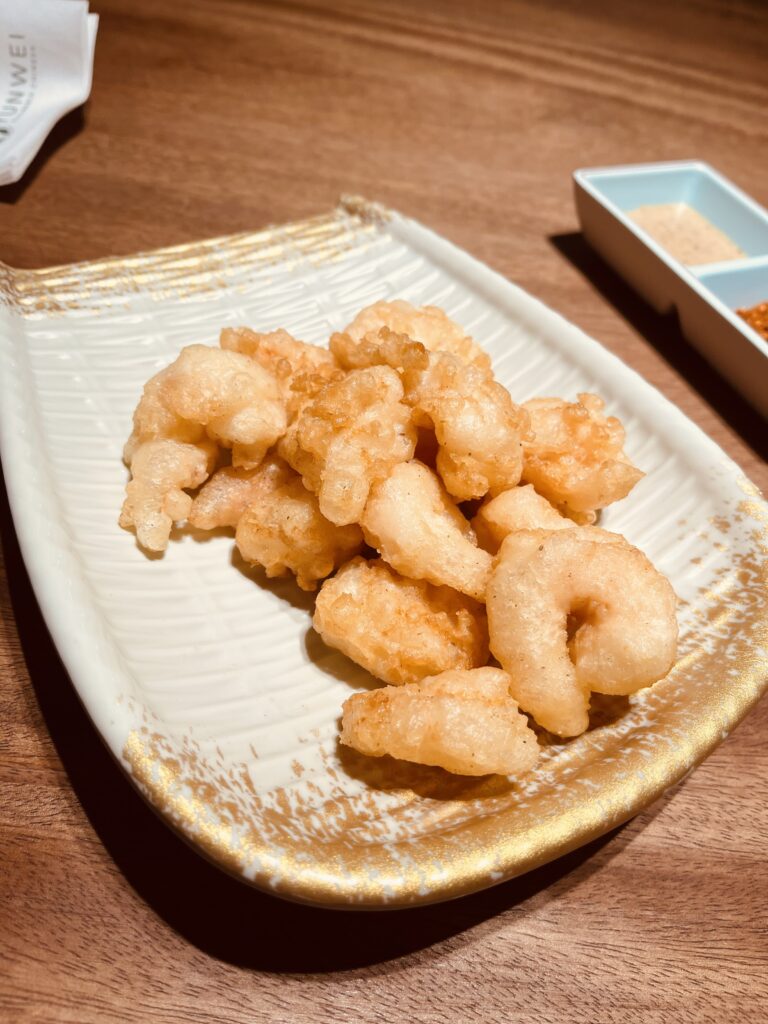 Já meu marido pediu a “Pipoca de Camarão Crocante” (entrada) e como eu não como frutos do mar, provei só a casquinha e adorei! O principal foi o “Yunwei Beef Arroz” (arroz com várias especiarias) com o “Mapo Tofu” (tofu e carne moída com pasta de feijão, pimenta e óleo de gergelim). A entrada foi a que mais chamou a atenção dele, mas o tempero de todos estão super aprovados!