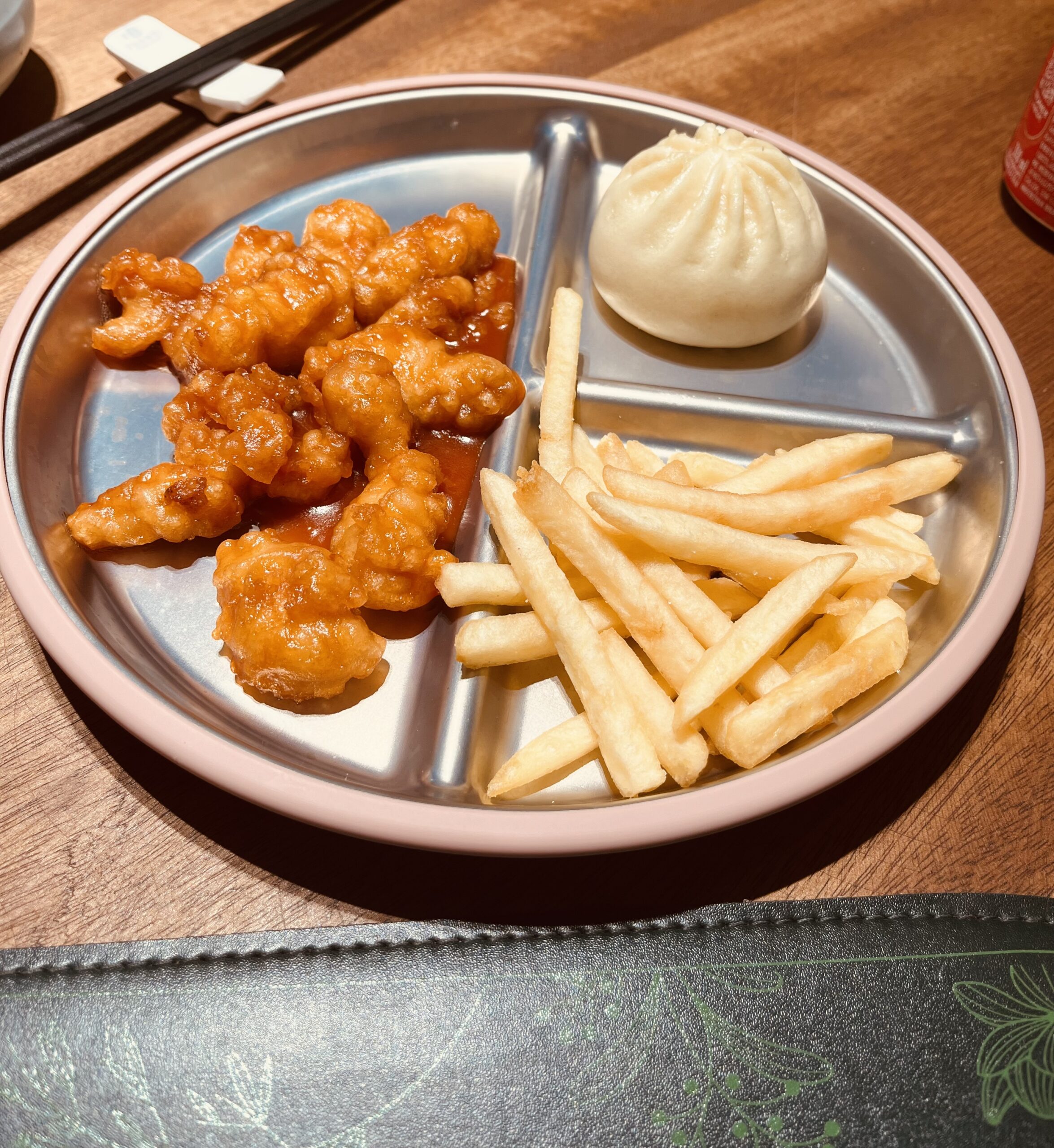 Ah! Eu sou meio chata para comer, mesmo tendo melhorado muito hehehe. Ai já fui no certo: prato infantil com uma batata frita que nunca erra hahaha. Mas para ser tradicional escolhi o “Tesouro Agridoce de Lombinho“, que só de lembrar dá água na boca. Também veio com o “Panda Pão de Carne“, que é bem tradicional e recheado com cebolinha, gengibre e carne.
